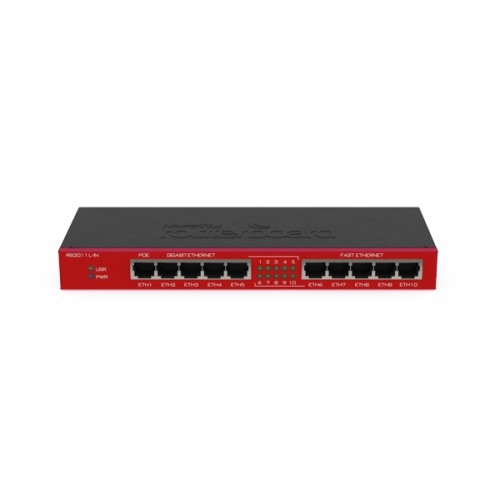 The RB2011 is a low cost multi port device series. Designed for indoor use, and available in many different cases, with a multitude of options. The RB2011iL-IN is the most basic model, with five Gigabit ethernet ports, five Fast ethernet ports, power jack and PoE support. It comes in a metal indoor case.
